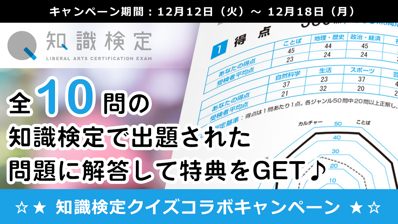 クイズ業界の著名人も受験した「知識検定」から厳選された4択クイズ 10 問に解答して、キャンペーン特典をゲットしよう♪